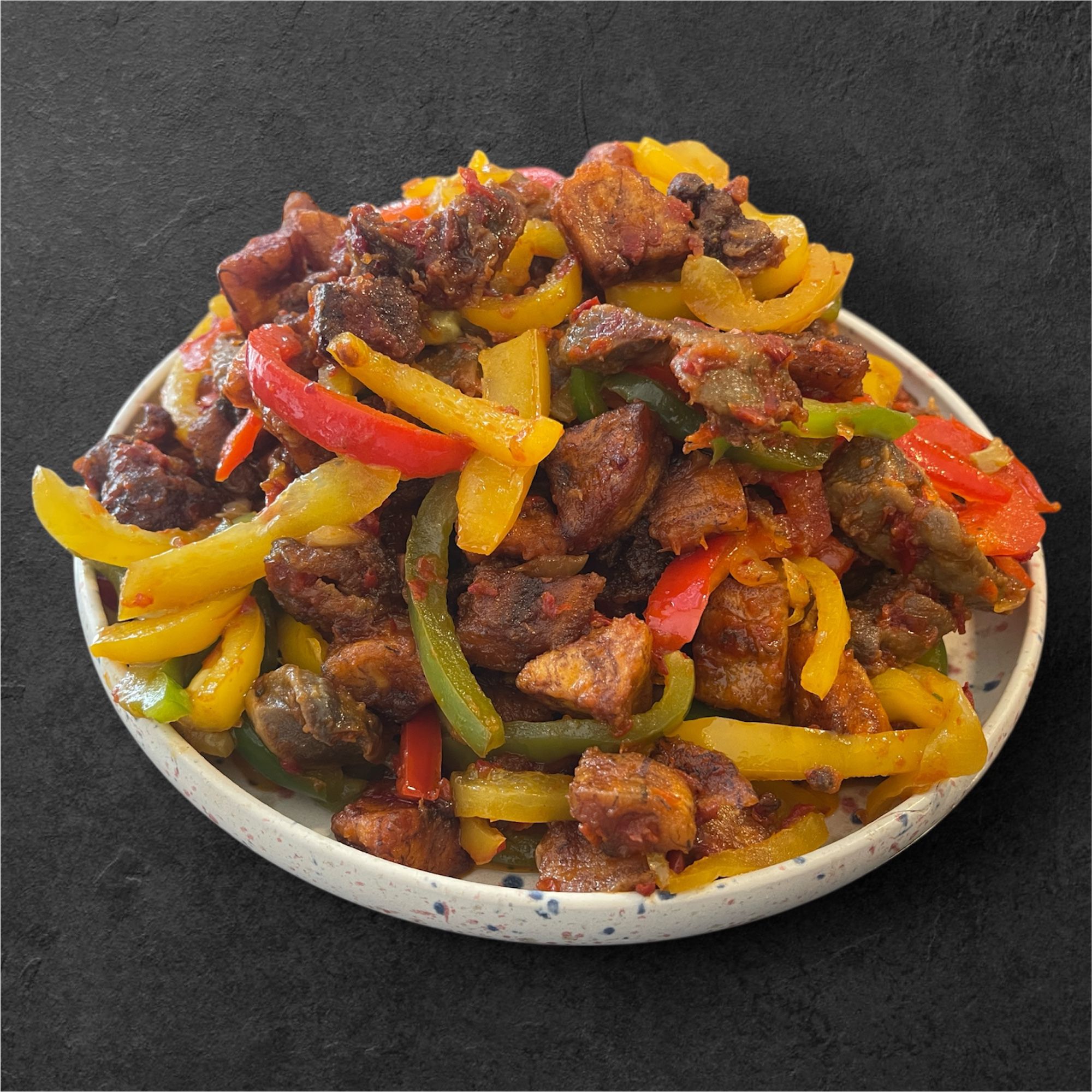 Fried chicken gizzard with diced plantain in a tasty pepper sauce. Great with all rice dishes as a side