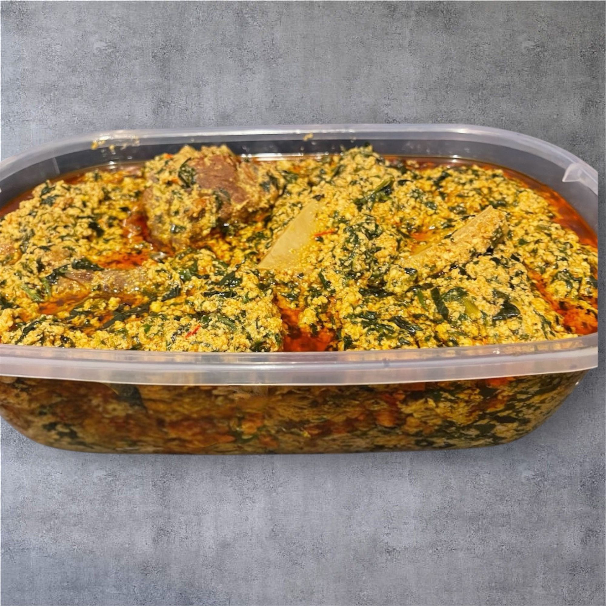 Prepared with Melon, spinach and cooked in peppers and vegetable oil. It comes with mixed meats, tripe,cow leg and crayfish. Best enjoyed with pounded yam or other “swallow” dishes.