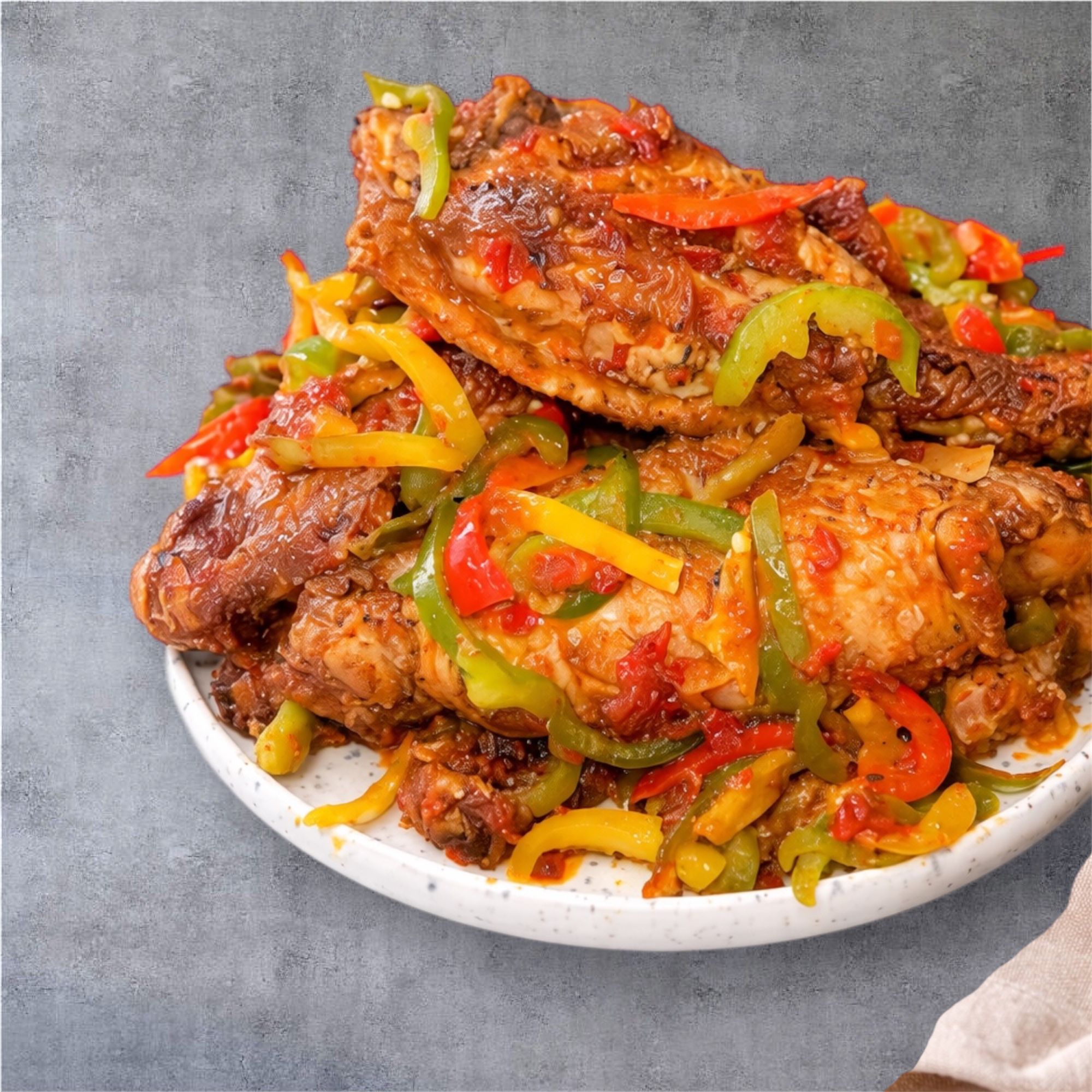 Marinated turkey cooked and fried and garnished in tomato and peppers sauce